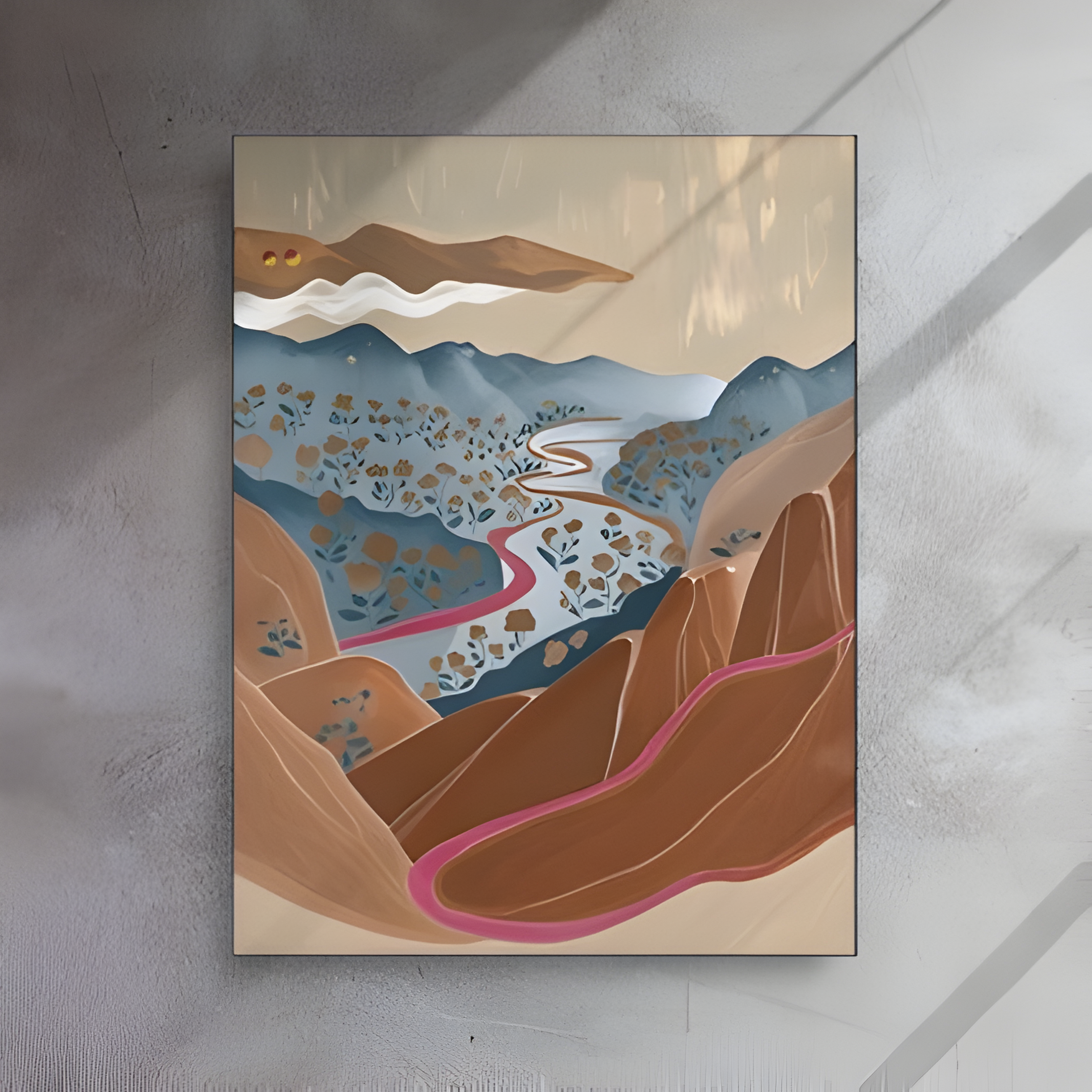 A warm, winding journey through terracotta and rust-colored cliffs. Terracotta River captures the movement of a soft, rose-tinted river that snakes between canyon-like formations, with indigo hills and scattered blossoms adding contrast and depth. The light is golden and still—like a late afternoon in the desert—and the composition guides the eye forward, curve by curve, until the horizon opens.